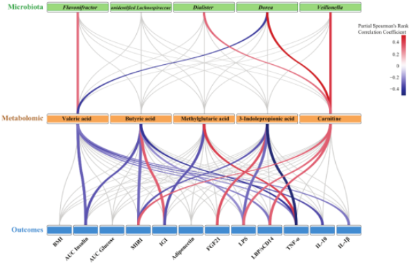 圖3.腸道菌群、共代謝物和葡萄糖穩態、腸道健康和炎癥的生物標志物之間的相關性分析。