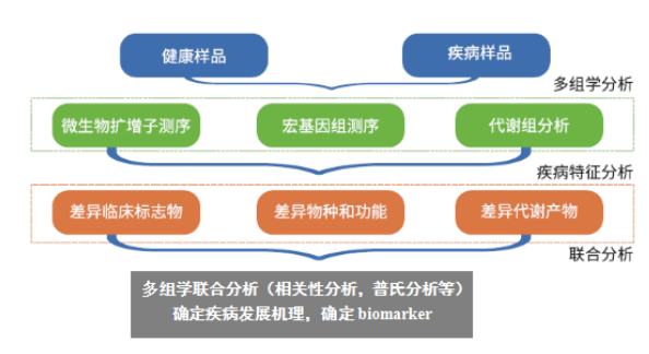 ?微生物組測序(主要指擴增子測序與宏基因組測序)可提供微生物組成、基因功能和豐度信息,而代謝組學是研究生物體中代謝產物變化的科學。生物科學研究過程復雜,單—組學往往無法全面的解決生物學問題,多組學就顯得尤為重要。近年來,隨著微生物組學研究的不斷發展和持續火熱,越來越多的研究者開始將微生物組學和代謝組學聯合起來,從物種、基因以及代謝產物等水平共同解釋科學問題,更好地理解疾病過程及機體內物質的代謝途徑,還有助于發現疾病的生物標記以更進—步應用千臨床輔助診斷。