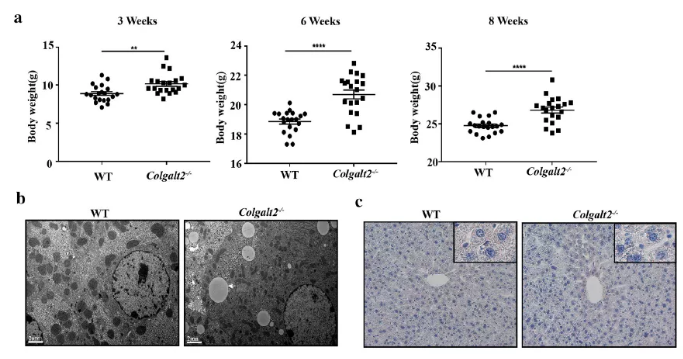 通過肝組織的PCR和western blotting,結果顯示Colgalt2?/?小鼠中不表達COLGALT2。在3,6,8周齡時分別對Colgalt2?/?和WT小鼠稱重,結果顯示Colgalt2敲除增加了小鼠的體重(圖1a)。通過透射電鏡觀察發現,6周齡Colgalt2?/?小鼠肝細胞中有脂滴聚集(圖1b)。然而,在6-8 周齡時,WT小鼠和Colgalt2?/?小鼠的肝油紅O染色和TG含量沒有明顯差異(圖1c)。