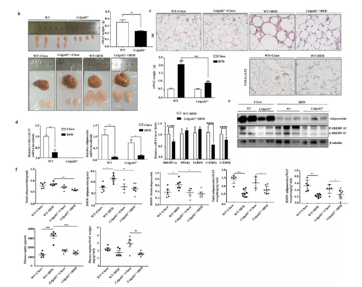 脂聯素對肝細胞有重要的抗脂肪變性作用。因此,為了檢測Colgalt2對脂聯素的影響,作者研究了脂聯素在白色脂肪組織WAT中的表達、血漿總脂聯素和HMW脂聯素水平。出人意料的是,在Colgalt2缺陷的小鼠中觀察到部分脂肪營養不良。與WT小鼠相比,Colgalt2?/?小鼠(6周齡)的eWAT體重降低(圖4b)。此外,在HFD喂養16周后,Colgalt2敲除抑制小鼠的脂肪組織擴張,而在WT小鼠脂肪組織明顯體積增大(圖4b)。脂肪形成由復雜的轉錄因子網絡(C/EBP家族成員,PPARγ,SREBP-1c等) 控制,這些因子在脂聯素基因表達、代謝和其他脂肪特異性基因中發揮重要作用。在HFD喂養的Colgalt2?/?小鼠中,C/EBPα、C/EBPβ和脂肪生成標記物SREBP1a有降低趨勢(圖4d)。此外,在HFD喂養的Colgalt2?/?小鼠中,p-SREBP-1c和n-SREBP- 1c蛋白表達明顯下調(圖4e)。