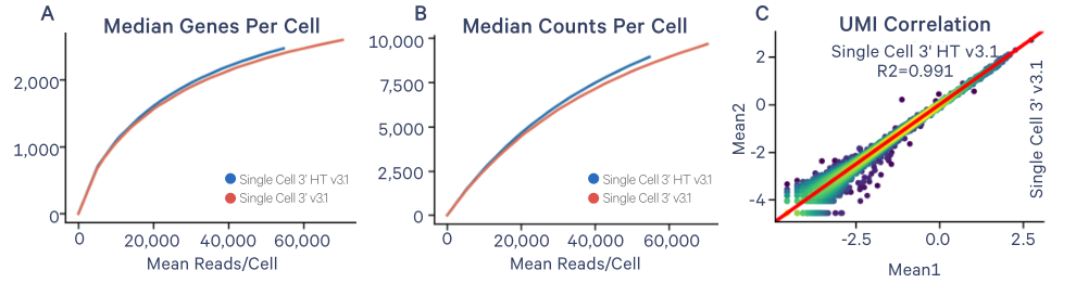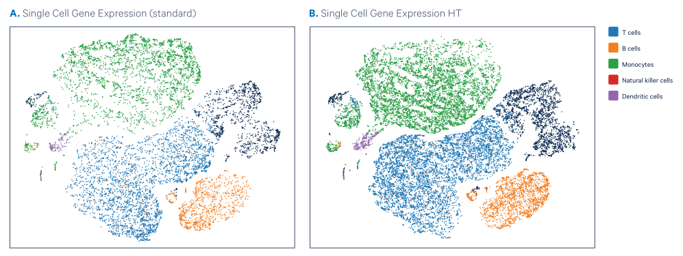 單細胞基因表達HT產(chǎn)生的數(shù)據(jù)可與標(biāo)準分析的數(shù)據(jù)相比較,在每個細胞成本降低的情況下,細胞數(shù)量增加了一倍,更利于鑒定更多的細胞表型和分子調(diào)控機制。