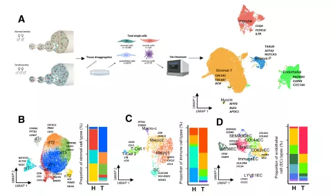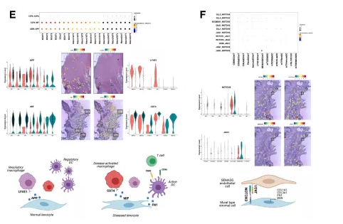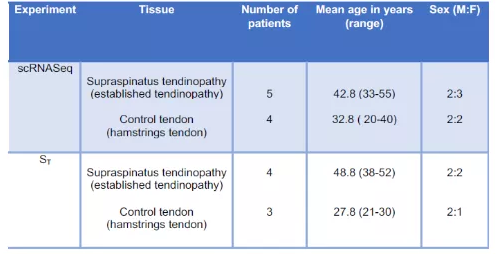 肌腱病,包括以疼痛和功能受限為特征的多因素肌腱疾病仍然是肌肉骨骼醫學的重大疑難問題。最近的研究結果強調了免疫介導機制在肌腱疾病中的關鍵作用,印證了通常與炎癥性風濕病和肌肉骨骼疾病 (RMD) 相關的關鍵的免疫學和生物力學因素,在肌腱中也會表現出來。單細胞技術(scRNAseq) 越來越多地應用于風濕病學,以識別驅動疾病發病機制的關鍵細胞表型。盡管在小細胞數量和異質肌腱活檢方面做出了努力,仍然沒有詳細的空間肌腱細胞圖譜預知轉化目標。因此本文利用scRNAseq和空間轉錄組(ST)強強聯合,進行細胞間相互作用分析以構建動態細胞微環境的圖譜,驅動人類慢性肌腱疾病的發展。