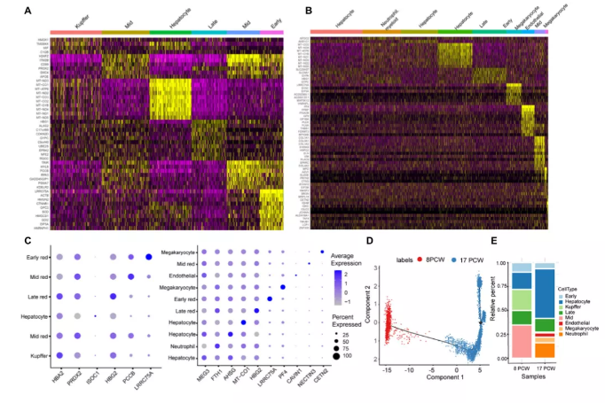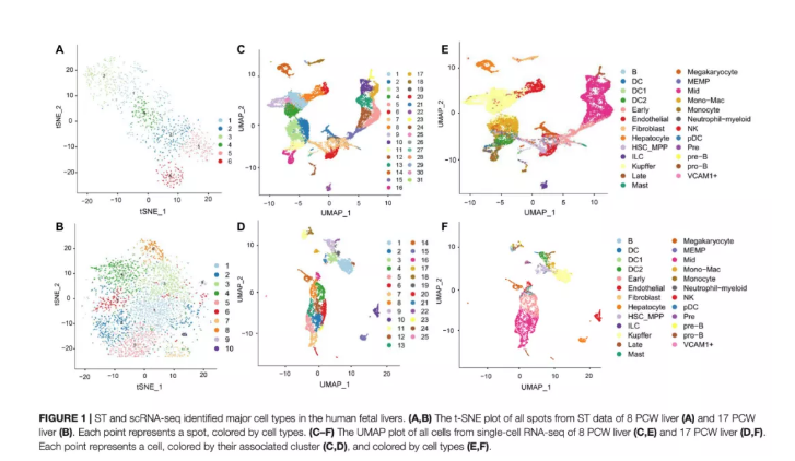 本文中作者結合了單細胞RNA測序和空間轉錄組學(ST)技術的優點,對人類從受孕后8周(PCW)到17周(PCW)的胎兒肝臟進行了分析。系統地鑒定了9種細胞類型,并確定了主要細胞類型的發育途徑。結果表明,人胎肝在實驗期間經歷了血液的快速生長和遷移,并鑒定了紅系細胞發育過程中的差異表達基因和代謝變化。此外,作者還對肝病相關基因的表達進行了研究,發現17個已發表并與肝病相關的基因主要在巨核細胞和內皮細胞中表達,在其他細胞類型中幾乎不表達。總之,作者的研究結果提供了一個全面而清晰的了解人類胚胎肝臟中所有主要細胞類型的分化過程,這可能為肝臟疾病的治療和肝臟再生提供參考數據和信息。