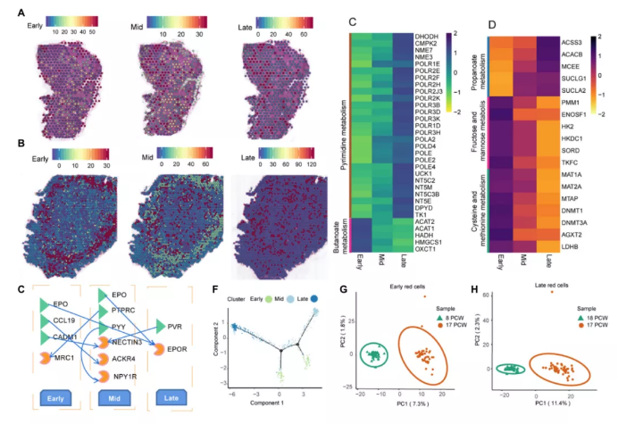 對下調基因的KEGG富集分析顯示,最顯著的包括果糖和甘露糖代謝、半胱氨酸和蛋氨酸代謝、牛磺酸和低牛磺酸代謝、組氨酸和硫胺代謝相關的信號通路。上調基因的高度富集項與丙酸代謝有關(圖5D)。作者進行了早、中、晚期細胞間的配體-受體相互作用分析,發現在早期-中晚期細胞通訊中發現了促紅細胞生成素(EPO)、蛋白酪氨酸磷酸酶受體C(PTPRC)、連接蛋白細胞粘附分子3(NECTIN3)(圖5E)。此外,還對紅細胞的分化軌跡進行了分析,得出了一條緊密相連的分化軌跡,分化成五個主要分支(圖5F)。這表明系統是通過一個連續的而不是幾個斷開的譜系來維持的。此外,在8PCW肝臟和17PCW肝臟的早期、中期和晚期紅細胞中分別鑒定了617、674和503個DEGs。為了進一步了解8PCW肝臟和17PCW肝臟之間紅細胞的差異,對兩個胚胎階段的基因表達模式進行了PCA分析。從每種細胞類型中取樣50個點以產生平衡的數據集,并且發現基于它們的轉錄相似性可以區分8 PCW和17 PCW肝臟中的所有點(圖5G,H)。