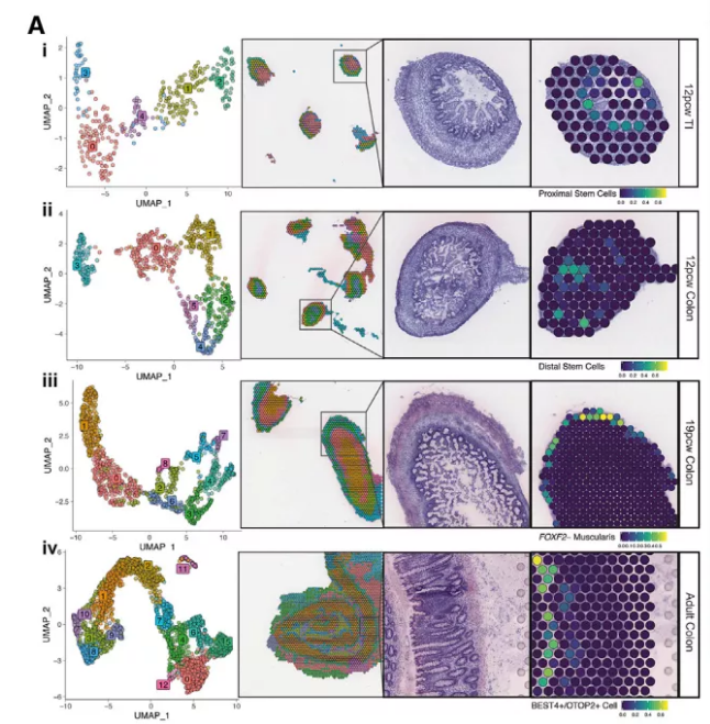 注:左側(cè)圖為ST的各個簇(cluster)的UMAP展示;左側(cè)中間圖為 clusters 在空間組織上的聚類可視化展示;右側(cè)圖為 ST 與 scRNA-Seq 細(xì)胞類型注釋結(jié)果的整合