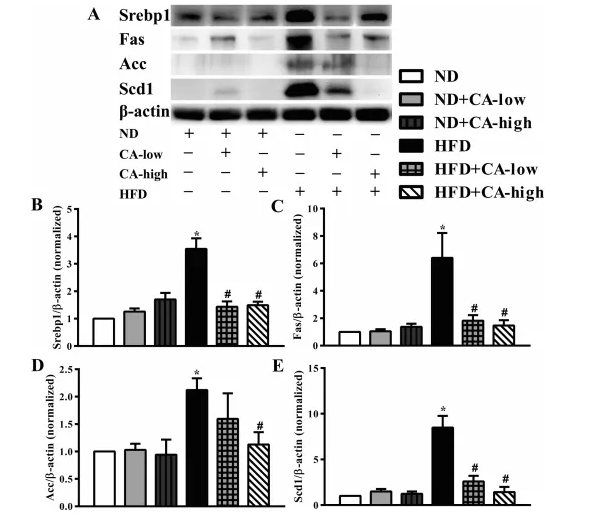 3.補充CA可調節高脂喂養小鼠脂肪生成相關蛋白表達