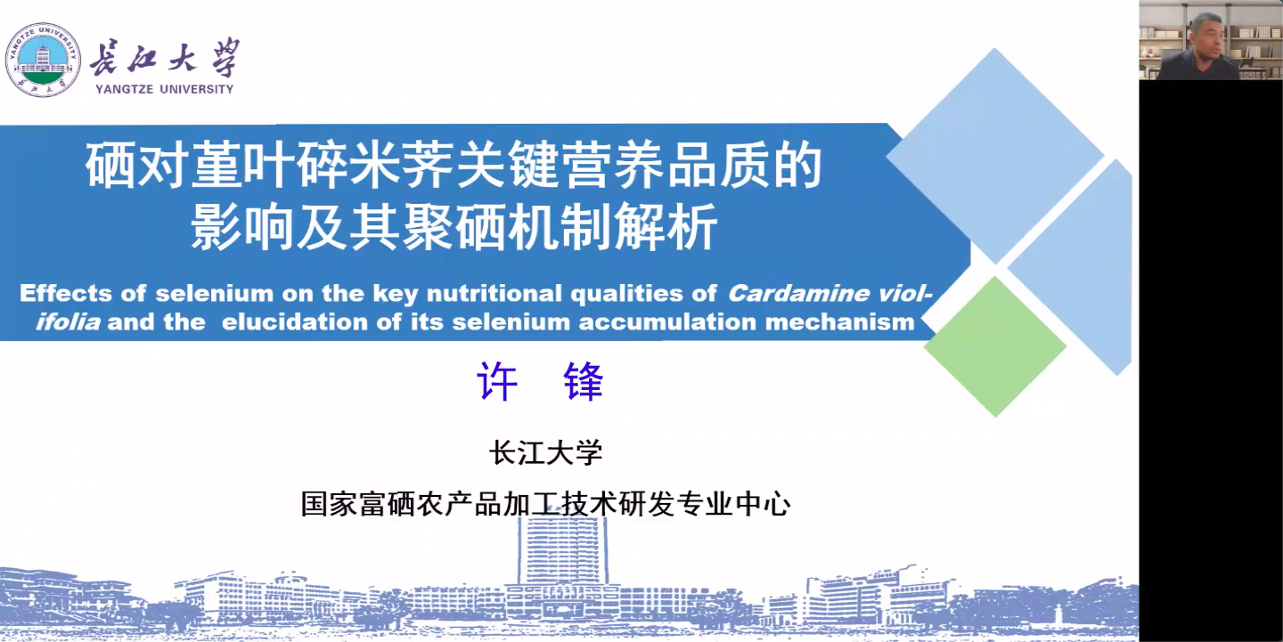 長(zhǎng)江大學(xué)許鋒教授首先報(bào)告了外源硒處理下,堇葉碎米薺在幼苗期和成熟期都積累高含量的硒;然后講解了不同濃度的硒處理下,通過(guò)轉(zhuǎn)錄組、蛋白組和代謝組解析堇葉碎米薺的分子機(jī)制的研究工作,認(rèn)為相關(guān)基因的表達(dá)變化減少了硫元素消耗,優(yōu)化了硫元素利用,可能是堇葉碎米薺耐硒的重要原因。