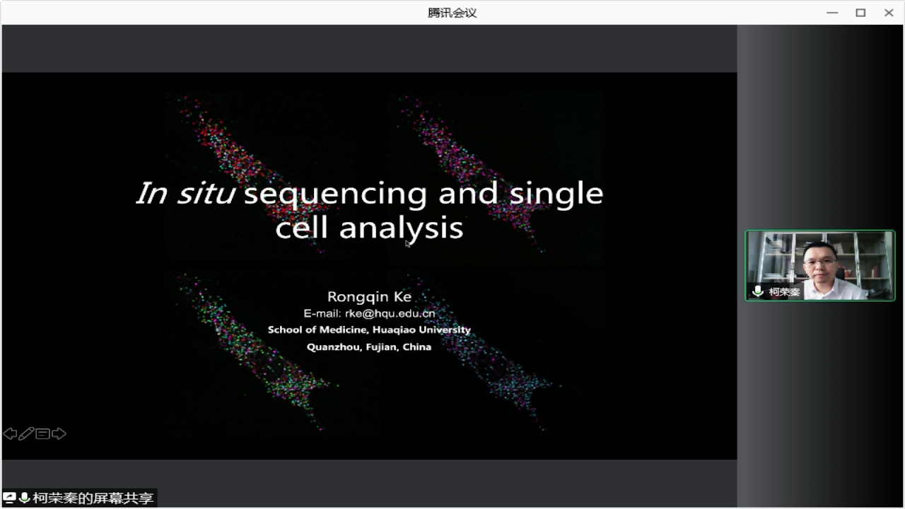 午后休息結束,華僑大學醫學院柯榮秦教授帶來的報告是:原位測序技術與單細胞分析?;趩渭毎麥y序的基因表達分析需要將單個細胞從組織中分離出來,這個過程使所分析的單細胞丟失了空間位置信息??吕蠋焾F隊開發了原位測序(in situ sequencing, ISS),是一種基于成像的空間轉錄組學技術。該技術可以在細胞甚至亞細胞分辨率下提供低通量到高通量的空間基因表達信息,將ISS技術應用于癌癥組織中基因表達異質性的可視化分析,并將之應用于人腦組織單細胞測序所獲得的感興趣的基因的定位以補充其失去的空間位置信息。此外,還開發了一系列新型的具有更高的檢測靈敏度和更好的分辨率的單分子RNA原位雜交方法,可以在細胞和組織中對感興趣的RNA轉錄本進行原位成像分析。我們相信我們所開發的原位RNA表達分析技術具有廣泛地用于生物和醫學的研究的潛力。