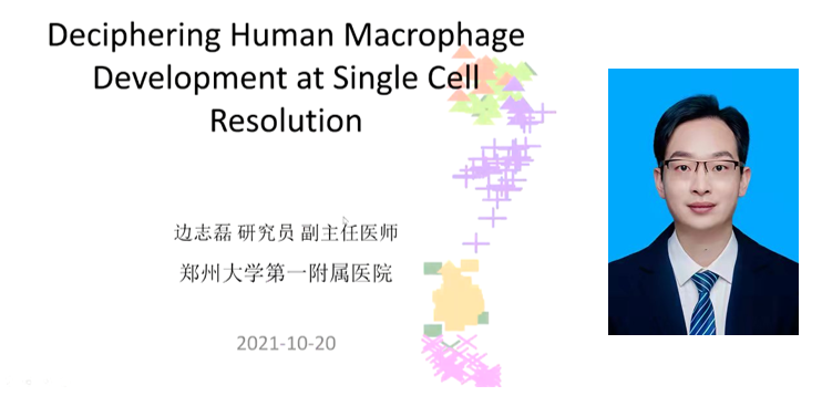 前面兩場報告湯老師和曹老師都是開發了單細胞空間新技術,這些技術如何實現在臨床醫學,特別是在腫瘤中精準輔助治療應用呢?鄭州大學第一附屬醫院血液科副主任醫師邊志磊研究員報告題目是:Deciphering human macrophage development at single-cell resolution,以超高單細胞分辨率深度解析了巨噬細胞發育。邊老師團隊繪制了巨噬細胞在多個解剖部位的異質性,并確定了不同的亞群,包括各種類型的胚胎組織駐留巨噬細胞(TRMs)(在頭部、肝臟、肺和皮膚)。追蹤了胚胎卵黃囊來源的原始巨噬細胞或卵黃囊衍生的偏髓性祖細胞(YSMPs)來源的胚胎肝單核細胞中TRM的發育軌跡,評估了胚胎期TRM和成年期TRM之間的分子相似性。全面描述了人類胚胎發生過程中早期巨噬細胞發育的時空動態特征,為進一步研究人類TRM的發育和功能提供了參考。