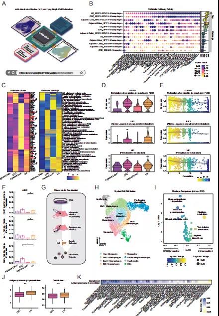 為了說明代謝重編程與巨噬細胞表型變化的關聯,本研究計算了巨噬細胞的經典通路評分,例如抗原加工、呈遞、炎癥、血管生成、免疫抑制、吞噬作用、白細胞介素信號通路和補體評分(圖 3J)。在LM中,MRC1+ CCL18+巨噬細胞的抗原加工和呈遞以及補體活性評分顯著增加(圖 3J),SPP1+巨噬細胞也顯示出類似的趨勢。某些基因如HLA-A(MHC I類分子之一)在LM的MRC1+ CCL18+巨噬細胞中上調。進一步分析了42種腫瘤高代謝途徑與MRC1+ CCL18+巨噬細胞通路評分之間的相關性,發現包括戊糖和葡萄糖醛酸互變在內的幾種巨噬細胞特異性代謝途徑與LM中的抗原加工和呈遞有很強的相關性,但在CRC的相關性很弱(圖 3K)。這些數據表明不同的代謝功能在MRC1+ CCL18+巨噬細胞表型中的潛在作用。