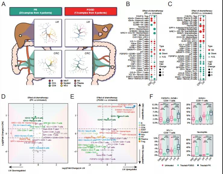 為探索NAC對腫瘤免疫的影響,本研究使用TooManyCells對所有CD45+細胞進行聚類分析,發現CRC和LM之間細胞聚類的顯著差異(圖 4A)。NAC對TME的影響高度依賴于細胞類型(圖 4B和4C)。通常,在PR中,NAC可以下調免疫抑制細胞并激活細胞毒性細胞(圖 4B)。在LM中,響應性NAC下調SPP1+巨噬細胞但上調細胞毒性T細胞,例如GZMK+CD8+ T細胞和XCL1+CD8+ T細胞(圖 4B和4D)。NAC-PR中僅剩下幾個MRC1+ CCL18+巨噬細胞和幾十個SPP1+巨噬細胞,表明NAC在抑制巨噬細胞中的潛在作用。然而,在PD/SD中,觀察到與PR不同的免疫細胞變化。例如,SPP1+巨噬細胞和MRC1+ CCL18+巨噬細胞在LM中增加,而細胞毒性免疫細胞(即FGFBP2+ GZMB+ CD8+ T細胞)下調(圖 4C、4E和4F)。這些結果可能與癌細胞的器官特異性和治療效果有關。例如,轉移性PD/SD癌細胞表現出DNA修復和脂肪酸代謝的特異性富集,而轉移性PR癌細胞與脂肪生成更相關。除腫瘤組織外,NAC上調鄰近正常肝臟中GZMB+CD8+ T細胞的比例,并增加PR患者PBMC中FGFBP2+GZMB+CD8+ T細胞的比例。對于PD/SD患者,在鄰近結腸和肝臟中也觀察到FGFBP2+ GZMB+CD8+ T細胞水平降低。總之,有效的NAC不僅重新編程了腫瘤內免疫平衡,還激活了全身抗腫瘤免疫反應,為支持NAC在可切除CRLM中的潛在作用提供了證據。
