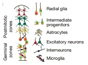 圖1:發(fā)育中皮質(zhì)的橫截面示意圖,顯示了主要細胞類型。