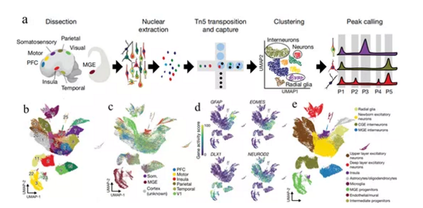 在哺乳動物發(fā)育過程中,染色質(zhì)狀態(tài)的差異與細胞分化相一致,反映了基因調(diào)控圖譜的變化。在大腦發(fā)育過程中,細胞命運和圖譜特征對于定義細胞特征和賦予神經(jīng)發(fā)育障礙選擇脆弱性非常重要。為了確定發(fā)育中人腦的特定細胞類型的染色質(zhì)可及性模式,作者使用了一種單細胞轉(zhuǎn)座酶可及性測序分析方法(scATAC-seq),對來自人前腦的原始組織樣本進行了測序分析。應(yīng)用無偏估計來識別在神經(jīng)形成過程中經(jīng)歷了廣泛的細胞類型和大腦區(qū)域特異性可及性變化的基因組位點,并應(yīng)用綜合分析來預(yù)測特定細胞類型的候選調(diào)控元件。結(jié)果發(fā)現(xiàn),腦類器官包含了大多數(shù)假定的細胞類型特異性增強子可及性模式,但缺乏許多體內(nèi)發(fā)現(xiàn)的細胞類型特異性開放染色質(zhì)區(qū)域。對腦區(qū)域染色質(zhì)可及性進行系統(tǒng)比較,發(fā)現(xiàn)了大腦皮層神經(jīng)前體細胞之間出人意料的差異,表明視黃酸信號在前額葉皮質(zhì)神經(jīng)元譜系確定中起著重要作用。總之,結(jié)果揭示了染色質(zhì)狀態(tài)對細胞類型多樣性和細胞命運特異性的發(fā)展模式具有重要作用,并評估了腦類器官作為皮層發(fā)育模型的√確度和穩(wěn)定性。