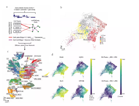 使用基因活性分?jǐn)?shù)來區(qū)分細胞類型,鑒定了多種主要的細胞類型,包括放射狀膠質(zhì)細胞(RGS)、中間前體細胞(IPC)、深層(皮質(zhì)V-VI層)興奮性神經(jīng)元(dlENs)、上層(皮質(zhì)II-IV層)興奮性神經(jīng)元(UlENs)、MGE和CGE來源的皮質(zhì)中間神經(jīng)元(分別為IN-MGES和IN-CGES)、胰島神經(jīng)元、MGE的前體細胞、小神經(jīng)膠質(zhì)細胞、少突膠質(zhì)前體細胞(OPCs)、內(nèi)皮細胞以及壁細胞。此外,結(jié)合scRNA-seq數(shù)據(jù),使用CellWalker將scATAC-seq細胞與細胞類型匹配。CellWalker以更精細的分辨率識別細胞類型和更廣泛的細胞亞型。此外,作者可以在兩種亞型(TRGS和ORGS)之間識別出不同的開放區(qū),這兩種亞型分別表達CRYAB和HOPX,這表明scATAC-seq能夠在高分辨率下區(qū)分細胞亞型,具有更高的靈敏度。
