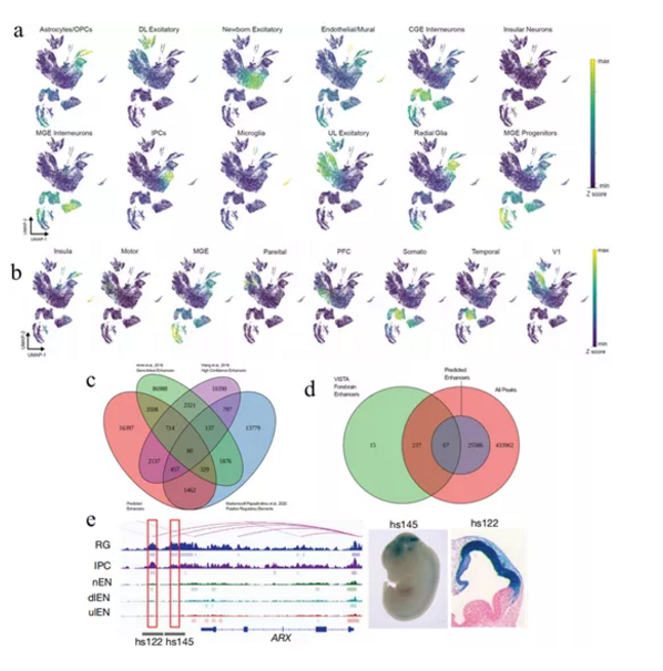為了鑒定候選增強子,整合了ATAC-seq、CUT&Tag、Hic和基因表達數(shù)據(jù),并使用接觸活性算法來預(yù)測所有類型的皮質(zhì)細胞的增強子-基因相互作用。共預(yù)測了25,659個基因連鎖增強子。其中在發(fā)育中的人皮層分離的細胞上進行了染色質(zhì)免疫沉淀和測序(PLAC-seq),發(fā)現(xiàn)了67,493個開放區(qū)以及10,050個預(yù)測的增強子,這些開放區(qū)和預(yù)測的增強子與預(yù)測的細胞類型特異性增強子相關(guān)的基因被富集。為了進一步驗證注釋的z確性,將開放區(qū)與從人類皮質(zhì)組織樣本生成的公開可用數(shù)據(jù)進行關(guān)聯(lián)分析。發(fā)現(xiàn)scATAC-seq鑒定到了混合測序數(shù)據(jù)注釋的大多數(shù)開放區(qū),并且還鑒定了許多在混合數(shù)據(jù)中未預(yù)測的細胞類型特異性peaks,特別是富集在諸如小神經(jīng)膠質(zhì)細胞和內(nèi)皮細胞的稀有細胞群體中的開放區(qū)。在功能驗證的前腦增強子中,大多數(shù)(319個中的304個)與染色質(zhì)可及性開放區(qū)重疊,但只有67個重疊的增強子是通過激活接觸方法進行預(yù)測。總之,這些分析表明,scATAC-seq是一種從異質(zhì)組織樣本中檢測染色質(zhì)可及性模式的可靠方法。然而,預(yù)測的增強子與以前發(fā)表的研究的有限重疊表明,迫切需要更好地理解預(yù)測調(diào)控潛力的計算機算法的相關(guān)特征。