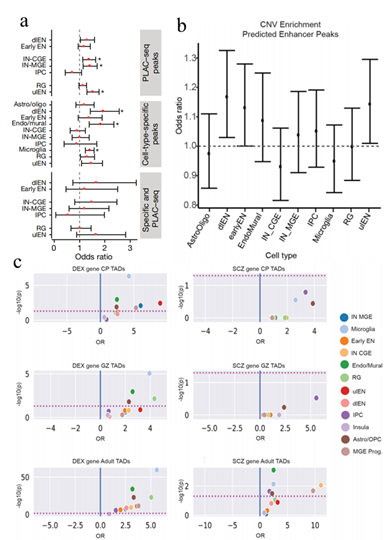 不同發(fā)育階段和分化狀態(tài)的染色質(zhì)狀態(tài)的細胞分辨率數(shù)據(jù)可能提供突變和發(fā)育中的不同細胞類型選擇性脆弱性之間的聯(lián)系。為此,研究者將特定細胞類型的ATAC-seq peaks和預(yù)測的增強子與疾病相關(guān)的常見和罕見的非編碼突變體記性關(guān)聯(lián)分析。首先分析了細胞類型特異性的peaks sets、預(yù)測的增強子、啟動子相互作用區(qū)域與基因組區(qū)域重疊的peaks值,這些區(qū)域在發(fā)育遲緩的個體中富集了拷貝數(shù)變異;結(jié)果發(fā)現(xiàn)dlEN、內(nèi)皮/壁層和小神經(jīng)膠質(zhì)細胞特異性peaks顯著富集,以及中間神經(jīng)元中重疊啟動子相互作用區(qū)的peaks顯著富集。