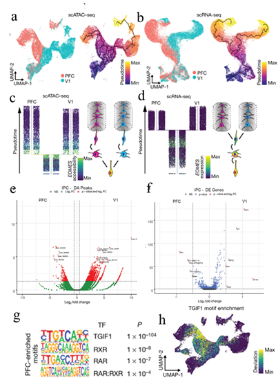 在神經(jīng)發(fā)生的早期,出現(xiàn)了特定區(qū)域類型的皮質(zhì)興奮性神經(jīng)元,但在不同區(qū)域的前體細胞之間只發(fā)現(xiàn)了有限的轉(zhuǎn)錄差異。調(diào)控元件的可及性變化通常先于基因表達。研究者比較了頭-尾軸兩端、PFC和V1的興奮性譜系細胞的scRNA-seq和scATAC-seq圖譜。在每種模式中,對細胞進行擬時間分析,確定分化軌跡,并沿著該軌跡確定PFC和V1譜系之間轉(zhuǎn)錄或染色質(zhì)狀態(tài)差異變得明顯的“分支點”。與轉(zhuǎn)錄組數(shù)據(jù)揭示了興奮性神經(jīng)元的區(qū)域特異性分群不同的是,染色質(zhì)狀態(tài)特征表明PFC和V1中間前體細胞群體之間存在顯著差異。在轉(zhuǎn)錄水平上,PFC和V1IPCs只有少數(shù)幾個基因有差異表達,而染色質(zhì)可及性分析發(fā)現(xiàn)這些細胞類型之間有1800多個差異可及區(qū)。