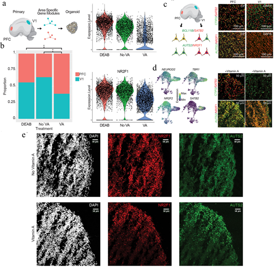 在哺乳動物大腦發(fā)育的過程中,視黃酸信號在神經(jīng)組織中發(fā)揮著重要的作用。為了測試RA是否促進人類PFC的分化,在含有或不含有維生素A(RA合成的前體)的情況下培養(yǎng)皮質(zhì)類器官。同時利用DEAB(一種有效的RA合成抑制劑)處理與維生素A一起培養(yǎng)的腦類器官。在分化的第10周,此時深層神經(jīng)正在發(fā)生,利用scRNA-seq分析了腦類器官。發(fā)現(xiàn)在維生素A存在下培養(yǎng)的興奮性前腦神經(jīng)元與不含維生素A或在DEAB存在下培養(yǎng)的腦類器官的神經(jīng)元是分開聚類的。還發(fā)現(xiàn)了區(qū)分PFC和V1皮層神經(jīng)元的信號。利用目前的分類方法注釋類器官神經(jīng)元中的PFC和V1神經(jīng)元的特征;與未使用維生素A培養(yǎng)或使用DEAB處理的神經(jīng)元相比,維生素A培養(yǎng)的類器官中PFC類似神經(jīng)元的比例始終較高。免疫染色證實了基因產(chǎn)物的差異表達,并發(fā)現(xiàn)與含有維生素A培養(yǎng)的腦類器官的PFC特性一致。這些發(fā)現(xiàn)表明,RA信號通路有助于人類皮質(zhì)發(fā)育過程中PFC神經(jīng)元譜系的發(fā)育。