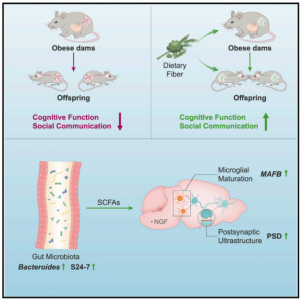 親肥胖與兒童認知和社交能力低下密切相關。此外,已經證明,母親肥胖會破壞后代的行為和腸道微生物群,母鼠或后代的高纖維飲食通過減輕突觸損傷和小膠質細胞成熟缺陷恢復了這兩種行為和腸道微生物群。共同居住和糞便微生物群移植實驗揭示了微生物群與行為變化之間的因果關系。此外,用微生物群衍生的短鏈脂肪酸治療也減輕了肥胖母鼠后代的行為缺陷。總之,研究表明,微生物群代謝物腦軸可能是母親肥胖引起的認知和社會功能障礙的基礎,高膳食纖維攝入可能是一種有希望的干預措施。