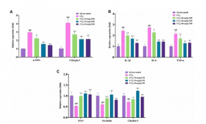 首先,作者分析了α-SMA和Collagen I的mRNA表達情況。如圖10A所示,與溶劑對照組相比CCl4組α-SMA和Collagen I表達顯著升高。隨后研究了IL-1β、IL-6和TNF-α 三種炎癥因子mRNA表達情況。如圖10B所示,與溶劑對照組相比CCl4組肝臟IL-1β、IL-6和TNF-α mRNA表達水平升高。