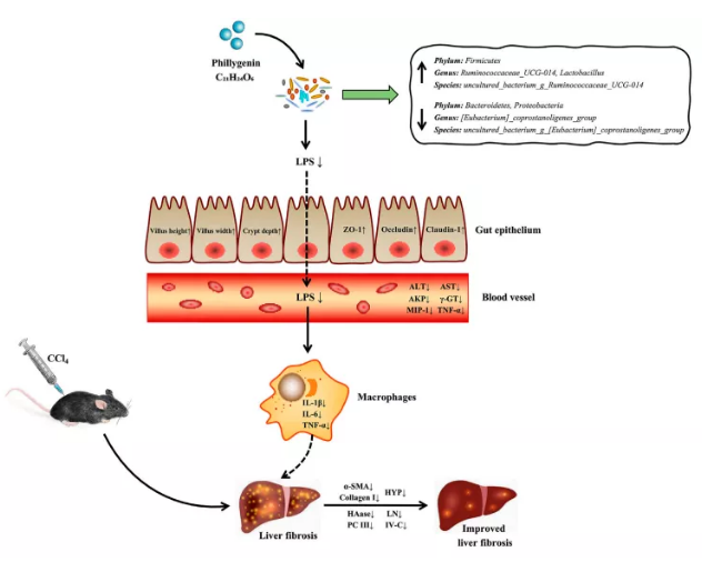 連翹素(PHI)具有良好的保肝作用,通過TLR4/MyD88/NF-κB信號通路抑制脂多糖誘導的促炎反應和LX2細胞的激活,從而緩解肝纖維化。此外,鑒于腸道菌群在肝纖維化發展過程中的重要作用,PHI的抗纖維化作用是否部分依賴于腸道菌群失調的調節尚不清楚。