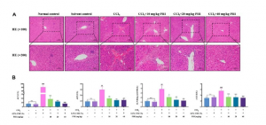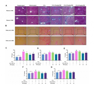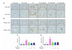 觀察纖維組織分布、Masson染色及Sirius red染色。如圖3A和B所示,Masson染色時膠原纖維呈藍色,Sirius red染色時呈紅色。結果表明,正常對照組和溶劑對照組幾乎不產生膠原纖維,而CCl4可誘導產生大量的膠原纖維。有趣的是,PHI處理顯著減少了肝臟中膠原的積累。