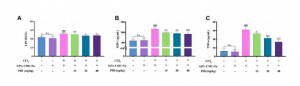 為了評價PHI的抗炎作用,作者檢測了血清中LPS、MIP-1和TNF-α的水平。如圖5所示,正常對照組與溶劑對照組LPS、MIP-1和TNF-α水平差異不顯著。與溶劑對照組相比,CCl4組LPS、MIP-1和TNF-α水平顯著升高。20和40mg/kg PHI可顯著降低LPS、MIP-1和TNF-α水平。