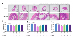 此外,作者測量了各組小鼠回腸絨毛高度、寬度和隱窩深度,結果如圖6B-D所示。正常對照組與溶劑對照組無明顯差異。與溶劑對照組相比,CCl4組回腸絨毛高度、寬度和隱窩深度顯著減少。PHI(20和40mg/kg)處理后上述指標減少均可逆轉。綜上所述PHI可以顯著改善腸道損傷。