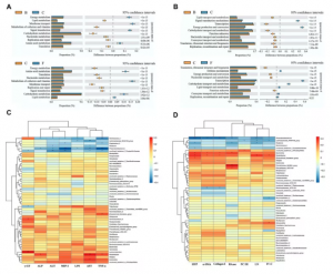 作者通過KEGG和COG數據庫預測了微生物的功能(圖9A和B)。CCl4處理組富集的通路為energy production and conversion、membrane transport和signal transduction mechanisms。肝纖維化小鼠PHI處理后,微生物富集的通路為carbohydrate transport and metabolism、lipid transport and