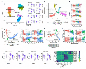 在基質(zhì)室中,作者鑒定了三種主要的細胞類型(圖5a,b)。Monocle2的偽時間軌跡分析揭示了5種CAF狀態(tài)。狀態(tài)1(s1)具有高表達的間充質(zhì)干細胞(MSCs)和炎性樣CAFs (iCAFs)特征。當(dāng)細胞向分化狀態(tài)s4和s5過渡時,這些標記物的表達減少,這種分化狀態(tài)通過增加ACTA2 (aSMA)、TAGLN、FAP和COL1A1的表達和富集ECM相關(guān)通路而類似于肌成纖維細胞樣CAF狀態(tài)。