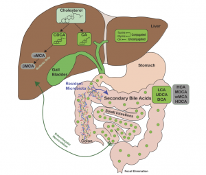 初級膽汁酸進入腸粘膜后,會產生50多種不同的次級膽汁酸。膽汁酸的化學多樣化是宿主(產生初級膽汁酸)和腸道微生物群(產生次級膽汁酸)共同努力的結果。最近,人們對腸道微生物-膽汁酸-宿主軸的研究正在擴展到包括胃腸學、內分泌學、腫瘤學和傳染病在內的多個領域。[1]