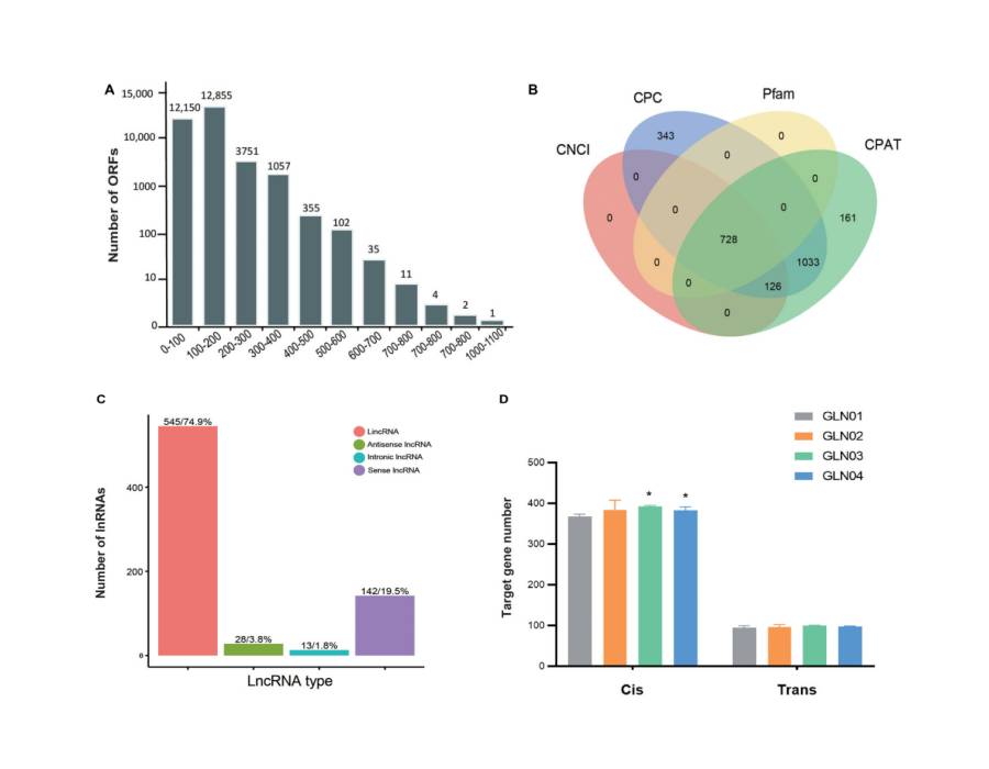 總共鑒定了38108個ORF,包括30323個(79.57%)完整的ORF,它們同時具有起始密碼子和終止密碼子。就完整的ORF而言,100-200 bp(12855個ORF)、0-100 bp(12150個)和200-300 bp(3751個)長度所占比例最大(圖3A)。共鑒定出728個lncRNAs,平均長度在298到4362 nt之間。這些lncRNAs進一步分類為545個基因間區lncRNAs(74.86%)、28個反義lncRNAs(3.85%)、13個內含子lncRNAs(1.79%)和142個正義lncRNAs(19.50%)(圖3C)。研究還發現,這些lncRNAs調控的順式靶基因比那些反式靶基因多(圖3D)。發現在GLN01和GLN03之間(Student t檢驗,p=0.002),以及GLN01和GLN04之間(p=0.037),這些lncRNAs調控的順式靶基因顯著增加,而這些lncRNAs調控的反式靶基因在整個莖發育過程中未發現顯著變化。
