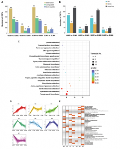 結果顯示GLN01和GLN04之間有492個DET,其中283個上調,209個下調(圖5A)。接著是GLN01和GLN02,GLN01和GLN03,分別有468個和136個。富集分析結果顯示,GLN01和GLN04之間的DET在三條KEGG途徑:“苯丙烷生物合成”(16個DET)、“淀粉和蔗糖代謝”(10個DET)和“氰基氨基酸代謝”(8個DET)中顯著富集(圖5C)。