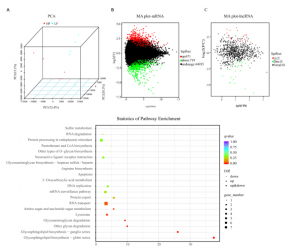 共鑒定出1390個mRNAs(671個上調,719個下調)和50個lncRNAs(22個上調,28個下調)(圖4B和C)。在本研究中,預測DE-lncRNAs與其靶mRNA協同發揮其功能,從而說明珊瑚對環境變化的適應。對lncRNA靶向mRNAs進行KEGG富集分析,以探索鹿角珊瑚lncRNAs的功能。根據KEGG分析,DE-lncRNA靶向mRNA在五條途徑中顯著富集(q值<0.05),如ko00603鞘糖脂生物合成-球狀系列、ko00531氨基糖降解、ko00604鞘糖脂生物合成-神經節苷脂系列、ko00511其他聚糖降解、ko04142溶酶體、,ko00520氨基糖和核苷酸糖代謝,以及ko03013 RNA轉運。