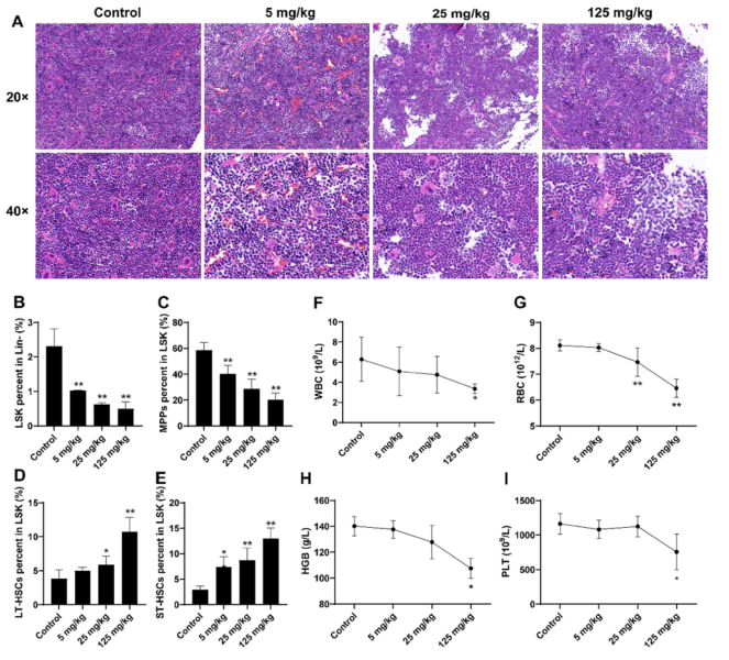 骨髓是苯暴露的主要靶器官,含有大量的造血干細胞。所有成熟的血細胞通常來源于造血干細胞( HSCs)。暴露于苯的小鼠股骨切片的H&E染色顯示出造血損傷的跡象。苯暴露小鼠骨髓中有核細胞密度明顯降低,主要表現(xiàn)為髓系造血細胞(WBC、RBC、巨核細胞和粒細胞)減少,細胞間隙增大,脂肪滴積聚,細胞腫脹。這些病理改變在125mg /kg苯組小鼠中更明顯,而在對照組中則不明顯(圖2A)。為進一步研究苯暴露對造血細胞生長和自我更新的影響,采用流式細胞術(shù)定量檢測造血干細胞LSK、多能祖細胞(MPPs)、長期造血干細胞(LT-HSCs)和短期造血干細胞(ST- HSCs)。這一結(jié)果表明,與對照組小鼠相比,接觸苯后LSK和MPPs降低,而 LT-HSCs和ST- HSCs增加(圖2B-E)。苯中毒是惡性腫瘤發(fā)生前的一種表現(xiàn),其特征是全血細胞計數(shù)顯著減少。該研究中,125 mg /kg苯組WBC、RBC、HGB和PLT水平顯著降低(P<0.05)(圖2F-I)。綜上所述,LSK比5 mg/kg和25 mg/kg苯暴露組的血液學變化更敏感,表明LSK可能是對造血損傷反應(yīng)的敏感指標。125 mg/kg苯暴露后,血液系統(tǒng)發(fā)生明顯變化,并形成苯毒性模型。