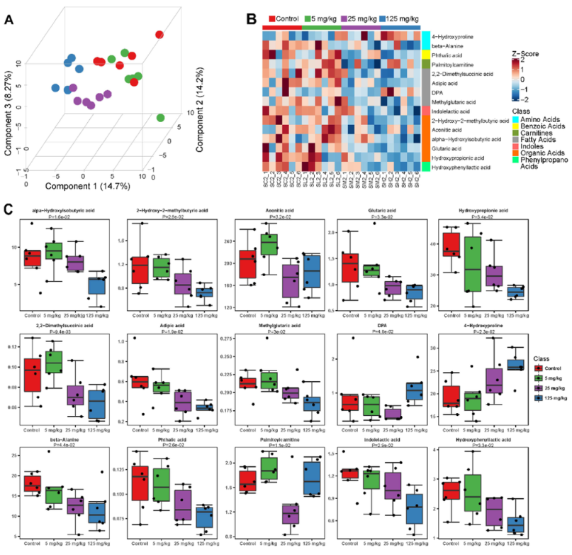 使用絕對定量代謝組學研究了苯暴露30天后血漿代謝物的差異變化。如圖4A所示,成功建立了PLS-DA模型,相似樣本聚集顯著。同時,分別用PLS-DA和Mann-Whitney U檢驗計算VIP值和P值。采用UPLC-MS/MS共鑒定了209種血漿代謝物,15種不同代謝物。在VIP>1和P<0.05閾值下,苯暴露小鼠與對照組之間的潛在生物標記物為羥基苯基乳酸),這些代謝物主要來自有機酸、脂肪酸、氨基酸、苯甲酸、肉堿、吲哚和苯丙酸(圖4B和表S2)。15種不同代謝物的劑量效應(yīng)關(guān)系如圖4C所示。