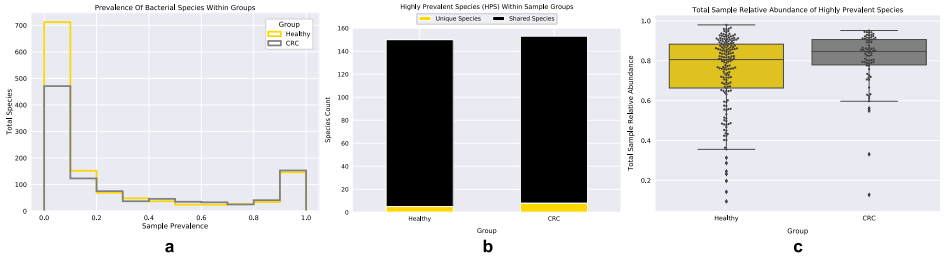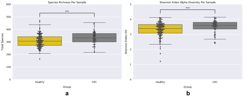 使用基于em的方法計算每個樣本內物種的相對豐度,以構建一個樣本分類單元矩陣,通過測量每個樣本的細菌豐富度和Shannon指數,利用該矩陣探究兩個樣本組(健康和晚期CRC)的微生物多樣性。CRC組的樣本顯示出更大的多樣性,包括豐富度和Shannon指數(Mann-Whitney U檢驗:MWU);豐富度:MWU pvalue = 0.0005, Shannon指數:MWU pvalue = 0.0009)(圖一a,b)。由于物種多樣性的量度對物種均勻度和豐富度的敏感性不同,還應用了辛普森指數來計算樣本組內的物種多樣性,這些結果與之前的分析一致,CRC樣本中的物種多樣性與健康樣本中的物種多樣性有顯著性差異(MWU值= 0.0238).