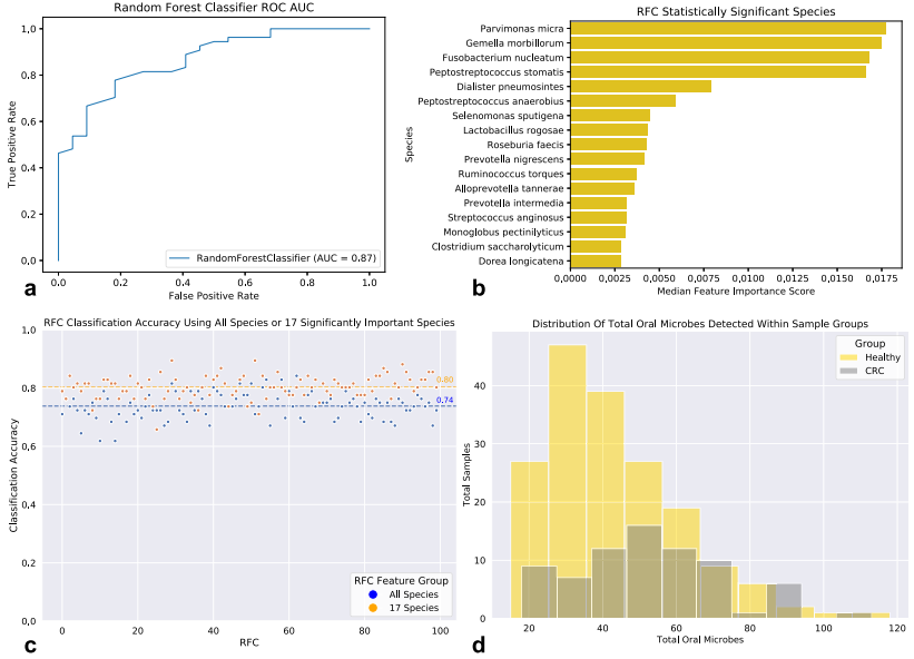 評估健康和晚期結直腸癌相關腸道微生物群之間的細菌群落分類特征差異。對樣本分類群矩陣進行CLR轉換,使用主成分分析進行基于分類剖面的樣本排序。前兩個主成分只能解釋總方差的一小部分(PC1: 7.98%,PC2: 5.61%),基于主成分分析的線性變換未顯示健康樣本與CRC樣本有差異,但通過隨機森林分類器(RFC)可以區分兩個樣本組(AUC = 0.87)(圖 2a)。雖然RFC根據重要性對物種進行排序,但這些默認度量是有一定偏差。為獲得RFC提供的物種重要度的統計顯著性,在我特征集中包含一個“隨機”特征。通過使用100個RFC的集合,發現了17種細菌,在這些顯著“重要”物種上訓練的100個RFC的準確性分類得分大于在所有物種上訓練的100個RFC的準確性分類得分(所有物種平均準確性為74%;17個非常“重要”的物種平均準確率為80%(圖 2c)。物種差異豐度分析顯示,與健康腸道微生物組相比,CRC相關腸道微生物組中有174個物種的相對豐度顯著降低,10個物種的相對豐度顯著升高。這174個細菌物種分別來自84個屬,大多數來自 Enterobacter(6.8%), Klebsiella(6.3%), Streptococcus(5.2%), Lactobacillus (5.1%), Citrobacter(4.6%), Bifidobacterium(4%),Bacteroides(3.4%),以及 Clostridium(3.4%)。CRC中相對豐度顯著升高的10個物種是 Parvimonas micra(qvalue = 3.09e-09), Peptostreptococcus stomatis(qvalue = 4.51e-08), Gemella morbillorum(qvalue = 4.55e-08), Fusobacterium nucleatum(qvalue = 1.08e-06), Streptococcus anginosus(qvalue = 1.13e-03), Dialister pneumosintes (qvalue=1.37e-03),Peptostreptococcus anaerobius (qvalue=4.74e-03), Streptococcus sp. KCOM 2412(Streptococcus periodonticum)(qvalue = 7.18e-03), Ruminococcus torques(qvalue = 1.55e-02),以及ilifactor alocis(qvalue = 2.85e-02)。