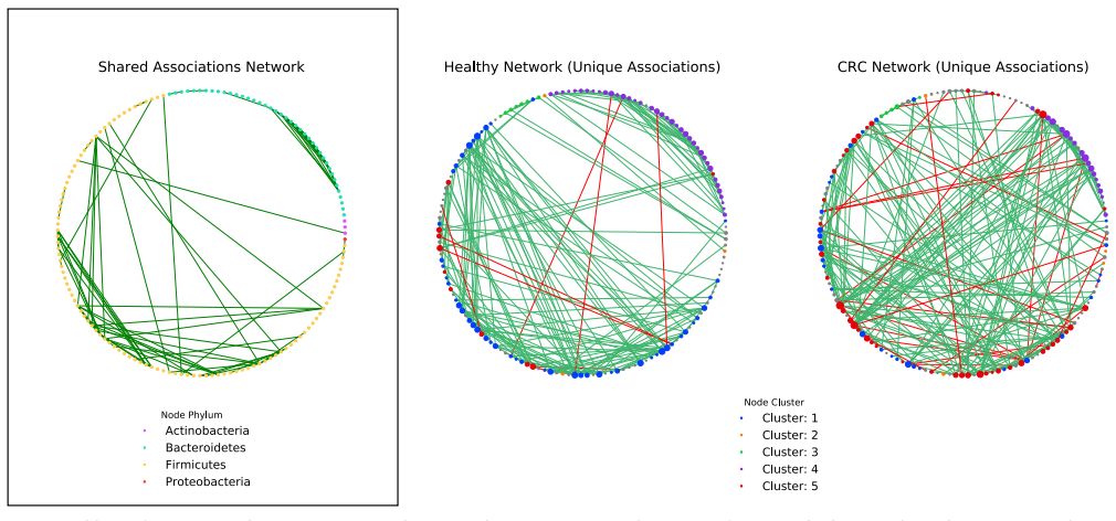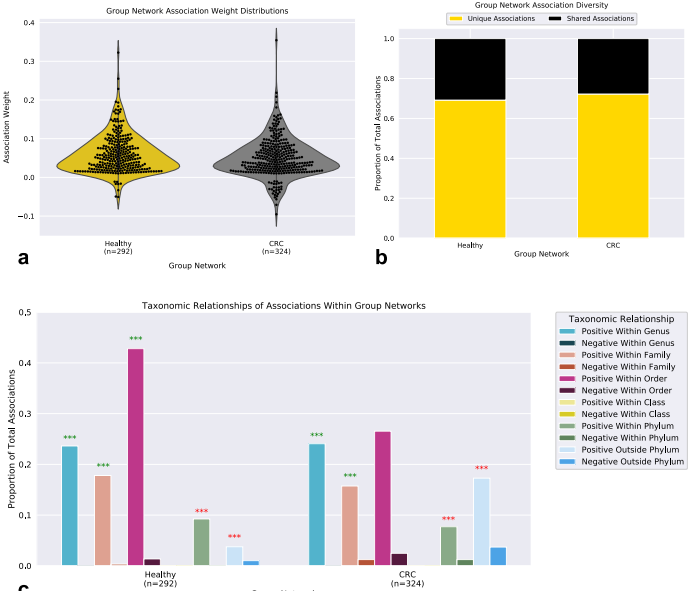 群體網絡包含相似的關聯權重分布,正相關比負相關更多(圖4a)。值得注意的是,與健康網絡相比,CRC包含更多的負相關。29%的負相關涉及一種被認為是口腔微生物的物種,而在健康網絡中,沒有發現涉及口腔菌群。在網絡中發現的大多數關聯是該網絡獨有的(健康:69%,CRC:72%)(圖4b)。我們假設群落結構的這種巨大差異可以反映生態系統的變化,并進而分析了網絡中物種之間的分類關系(圖4c)。兩個網絡在同一屬內的物種(健康:MCS pvalue= 0.00099,CRC:MCS pvalue= 0.00099)和家族(健康:MCS值= 0.00099,CRC:MCS= 0.00099 )。然而,只有在健康組的網絡中,物種與來自同一順序的其他物種的積極相關仍然明顯多于隨機相關(健康:MCS pvalue= 0.00099,CRC: MCS pvalue = 0.44)。與健康網絡(健康:4%,CRC:17%)相比,CRC的網絡在分類上的遠緣關系中顯示出更大的豐度,在健康網絡中分類上的遠緣微生物之間的正關聯仍然顯著較少(門內:MCS值= 0.00099,門外:MCSp值= 0.00099)和CRC(門內:MCS pvalue= 0.00099,門外:MCS pvalue= 0.00099)而不是隨機網絡。