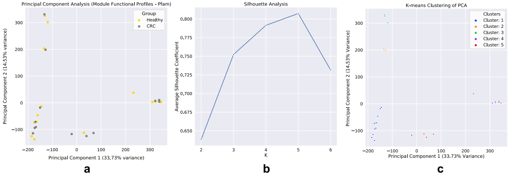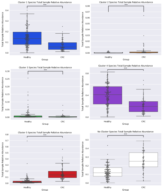 通過構建CLR轉換的模塊功能來比較模塊的潛在功能。模塊功能(蛋白域)圖譜的PCA顯示出較大的差異(PC1: 33.73%,PC2: 14.53%),模塊似乎形成包含兩組代表的簇團(圖 5a)。為了定義模塊的聚類,進行了輪廓分析,估計五個聚類作為用于K-均值聚類的最*K值(圖?5b)。通過K-均值聚類定義模塊聚類后(圖?5c)對這些集群進行了分類分析。在整個網絡中,同一集群內的模塊被發現在分類學上是相似的,不包括簇1和簇5,簇1和簇5顯示出物種占有的變化,其中在健康網絡的簇1內發現的一些物種被顯示在CRC組的簇5內。然而,兩個網絡對在簇2、3和4中發現的物種有很強的一致性。第2組中的物種僅有“致病菌”(即通常無害但在特定環境條件下具有致病能力的物種)口腔微生物,而簇3主要是鏈球菌種和簇4主要類桿菌種。隨后,進行聚類功能分析以發現蛋白質結構域,以及蛋白質家族的主要作用和次要作用,這使得聚類在功能上不同。簇1的功能與細胞表面粘附、對抗沖突策略、酪氨酸重組酶、多糖降解、糖胺聚糖結合、腫瘤蛋白酶抑制、過氧化物酶功能、碳水化合物/纖維素結合活性和氨基酸生物合成相關。簇2的功能涉及對宿主細胞和細胞外基質的粘附、細胞感染、膠原結合、補體抗性、鳥氨酸/賴氨酸/精氨酸脫羧酶(組織腐敗/多胺合成/酸性環境抗性)、金屬肽酶、V型分泌系統、氨的產生和有毒金屬離子的排泄(銅流出系統)、細胞包膜、DNA代謝、脂肪酸和磷脂代謝、表面多糖和脂多糖的生物合成和降解。簇3的功能與粘蛋白結合、鋅清除/吸收、細胞表面粘附、葡萄糖結合/轉運和銅結合、蛋白質和肽的命運/合成/分泌、多糖/碳水化合物、有機醇和酸的降解方面有關。簇4的功能涉及金屬結合、二瓜氨酸環化酶/磷酸二酯酶、群體感應、碳水化合物結合和半胱氨酸/木瓜蛋白酶、核苷和核苷酸、轉運和結合蛋白、TCA循環、鐵攜帶以及表面多糖的降解和生物合成。最后簇5的區別功能與氨肽酶、三羧酸受體、乙醇胺轉運、淀粉利用、木葡聚糖/多糖結合、能量代謝、氨基酸和胺、陽離子和鐵化合物、電子轉運以及表面多糖和脂多糖的生物合成和降解相關。檢查了在每個集群內發現的用于網絡構建的物種的豐度(健康:簇1 (33%)、簇2 (2%)、簇3 (5%)、簇4 (26%)、簇5 (7%)、無(27%);CRC:簇1 (19%)、簇2 (3%)、簇3 (3%)、簇4 (12%)、簇5 (30%)、無(33%)(圖6)。我們的發現表明,與健康組相比,在CRC中,第2類和第5類組模塊中發現的物種總數增加,第1類、第3類和第4類組中發現的物種減少。這些結果也反映在我們發現的總樣本相對豐度的統計顯著變化中,即群內物種在群間所占的比例(第一組: MWU值= 4.29 e-12;第二組:MWU值= 3.16 e-16;第三組:MWU值= 0.0002;第四組:MWU值= 2.62-13;第五組:MWUp值= 2.81 e-29;無集群物種:MWU值= 4.40-17(圖7)。此外,發現網絡內的大多數負面關聯(健康:100%,CRC:96%)發生在占據不同集群類型內模塊的物種之間。只有在CRC中,簇1的物種之間才出現集群內的負相關,其中物種種類和豐度也顯示出減少。