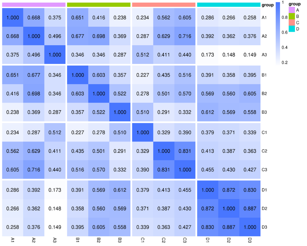 樣本相關(guān)性更改配色,并將組間隔開(kāi),更加直觀看出組內(nèi)重復(fù)性。