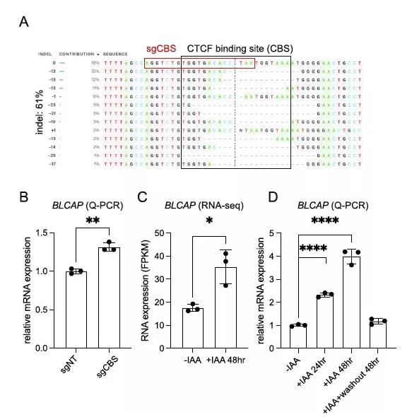 為了進一步驗證預測的假定絕緣子的作用,將慢病毒表達的引導RNA感染表達Cas9的SEM細胞中,然后進行抗生素選擇。Sanger基因組測序(Inference of CRISPR edit, ICE)在目標人群中檢測到約61%的總indel頻率(圖5A),與非靶向導向對照組(sgNT)相比,導致BLCAP mRNA表達顯著增加(圖5B)。用IAA處理CTCFAID細胞24和48小時,然后洗脫IAA進行CTCF修復。通過RNA-seq分析和Q-PCR驗證,驗證急性CTCF蛋白耗竭時BLCAP mRNA的表達(圖5C)。不出所料,生長素處理24或48 h后CTCF蛋白急性耗竭,BLCAP表達水平顯著升高。更重要的是,洗脫生長素后,其表達水平恢復到親本細胞的水平(圖5D)。綜上所述,這些數據有力地支持了CTCF在BLCAP調控區域的占用充當了控制BLCAP表達的功能絕緣體。