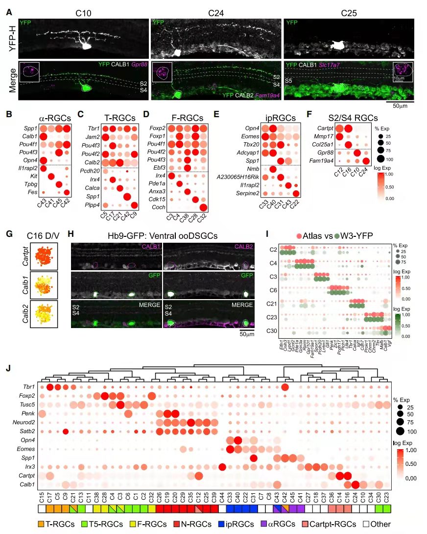 通過scRNA-seq和形態學對視網膜進行雙重驗證。結果發現aRGC為C41-43、45這4個cluster(圖 2B);之前的研究僅確定了4個T-RGC和4個F-RGC類型,但單細胞揭示了每個亞類中的第5種類型(分別為C9和C32;圖 2C和2D);同時ipRGC也發現了M1(C33和40)、M2(C31)和 M4(C43)類型的標記(圖 2E);ooDSGC中大部分是Cartpt+,通過Mmp17的表達確定了N-ooDSGC;C16表達的Col25a1,是D-和V-ooDSGC的marker。最后CALB1+細胞是D-ooDSGCs ,CALB2高表達細胞是V-ooDSGC(圖 2F-2H)。已知RGC子類與cluster存在部分重合,每種cluster不超過兩個子類。子類與cluster重合表達的基因如圖2J,如:4/5 T-RGCs (Tbr1+)、4/5 F-RGCs (Foxp2+)、5/9 T5-RGCs (Tusc5+)、4/5 ipRGCs(Opn4+)和3/4 aRGC(Spp1+)。另外還鑒定到了新的子類:如8個表達轉錄因子Neurod2和Satb2的cluster被化為N-RGC等。其余11/45類型未分配到子類,但它們確實表現出與其他類型的相關性。