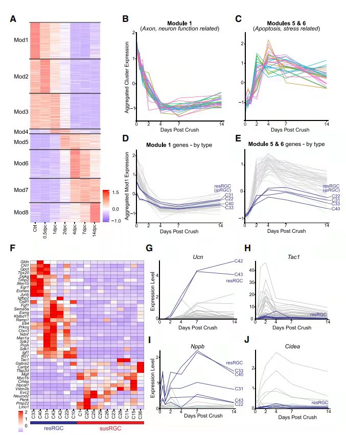 為了研究RGC中激活損傷反應,對ONC后的RGC進行基因表達譜分析,確定了771個在不同類型之間的DE基因,通過k均值聚類(圖 4A)劃分為8個模塊(Mod1-8),識別具有不同時間動態的基因集,這些基因集富集在不同的GO功能中,例如在0.5dpc開始下降的模塊1(Mod1)中的基因富集在健康神經元相關的GO功能中,如動作電位、突觸囊泡胞外/內吞作用和逆行軸突運輸(圖 4B)。相比之下,在Mod5和Mod6中的基因與細胞凋亡和應激途徑相關(圖 4C)。DE基因幾乎沒有表現出強烈的類型特異性差異,但ipRGC類型除外,Mod5、6和7中C22、C31、C33和C40中的基因的上調明顯低于其他類型(圖 4D和4E)。