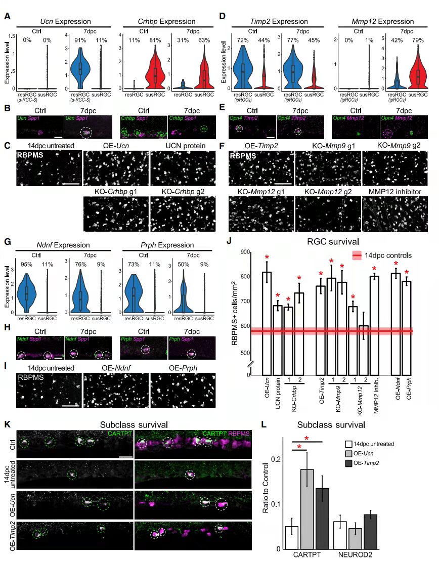 尿皮質素(Ucn),它編碼來自促腎上腺皮質激素釋放因子家族的肽;促腎上腺皮質激素釋放激素結合蛋白(Crhbp)。ONC后Ucn僅在aRGC中上調,而Crhbp在ONC前后susRGC中表達(圖 5A和5B)。過表達Ucn,注射Ucn重組蛋白,通過CRISPR和兩種不同的sgRNA敲除Crhbp,結果發現四種方式都顯著增加RGC的存活率(圖 5C和5J)。隨后又驗證了幾對基因的表達和功能富集情況,結果與Ucn和Crhbp類似。說明可以通過對基因的干預來保護部分脆弱的RGC類型。