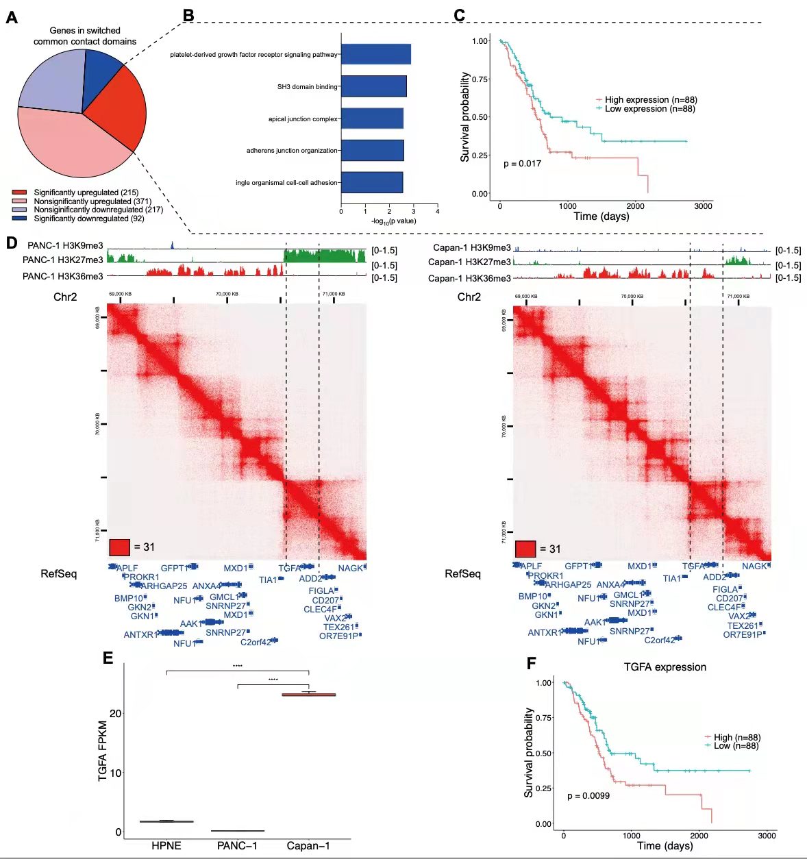 接下來,作者重點關注原發性和轉移性癌細胞之間的共同結構域。提取了位于共同結構域中的基因,發現這些基因中的大多數在轉移癌樣本中上調,并且GO分析顯示顯著上調的基因(log2FC≥ 1和調整p值≤ 0.05)在血小板衍生生長因子受體信號通路中富集(圖3b)。此外,作者利用TCGA胰腺癌患者隊列的基因表達數據和長期隨訪數據來確定這些基因的表達與患者生存率之間的相關性。分析表明,這些基因的高表達顯著降低了患者的生存率(p=0.0175,對數秩檢驗)(圖3c)。例如,TGFA基因,位于原發癌富集H3K27me3的結構域中,但位于轉移癌的富集H3K36me3的結構域中。而這個基因的高表達顯著降低了患者的生存周期(圖3f)。也就是說,共同結構域中的染色質狀態改變也可促進胰腺癌轉移。