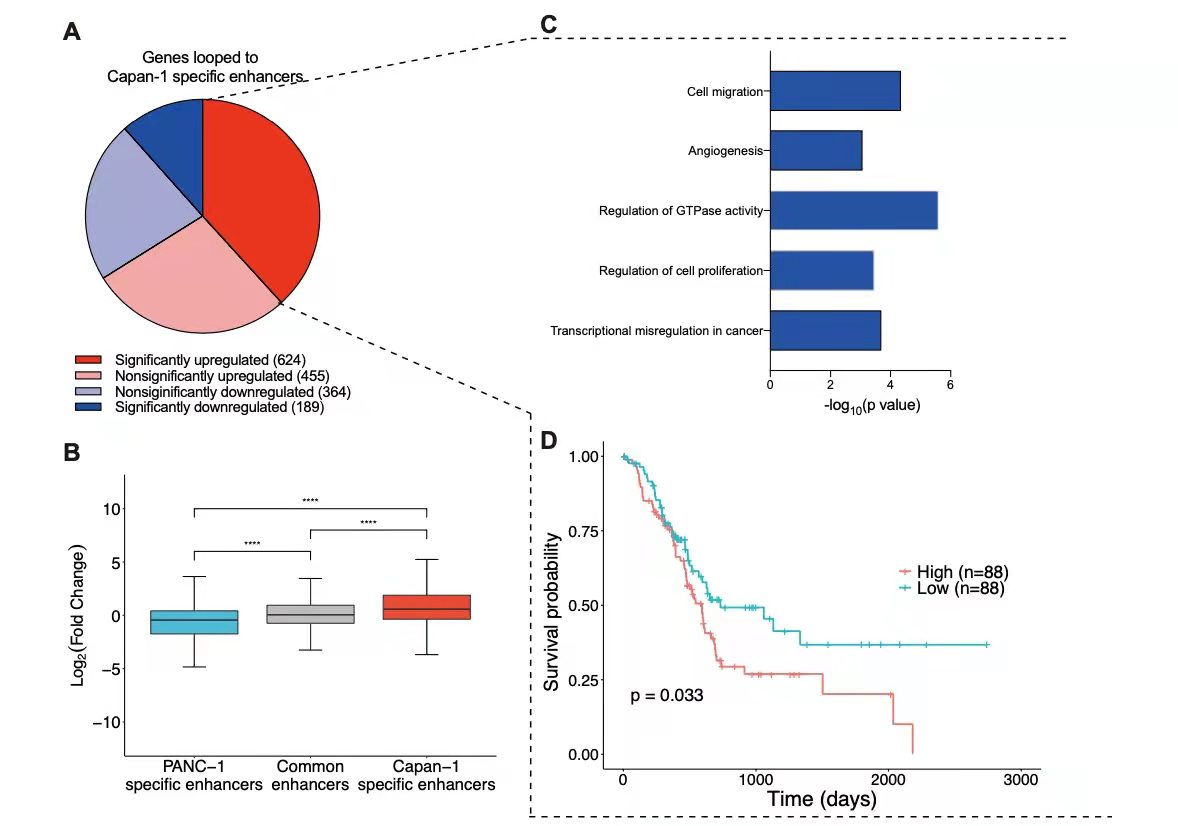 通過loop環的分析,loop數量與TAD總體趨勢類似,在轉移細胞癌中顯著增加。與原發癌細胞相比,大多數啟動子與Capan-1特異性增強子成環的基因表達上調,同時,這些基因的表達水平明顯高于與PANC-1特異性增強子連接的基因。作者對顯著上調基因富集分析發現:這些基因在細胞遷移和血管生成方面顯著富集(圖4c),表明這些基因與胰腺癌轉移相關;而且生存分析發現,這些基因的高表達與不良預后顯著相關(圖4d)。這些結果表明,胰腺癌轉移過程中環的變化可上調轉移相關基因。