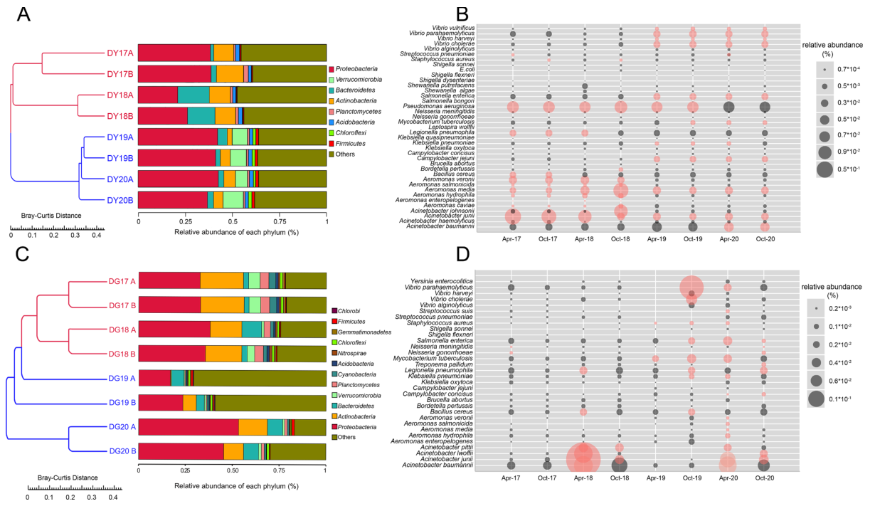 圖2. 東港市農業(DY)和城市污水(DG)采樣點細菌群落2017-2020年動態