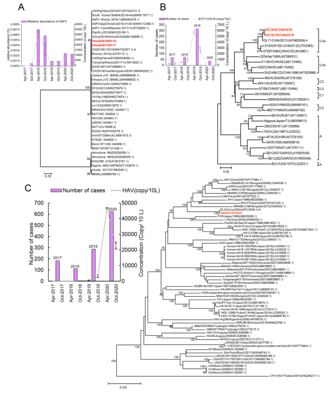 研究者選擇了兩個具有潛在公共衛生問題的地區(東港和湛江)進行了宏基因組測序,對毒力基因進行了致病性評估。結果表明,共檢測到90多種細菌病原體,其中56種含有毒力基因。在東港,發現了一株致病性不動桿菌屬(Acinetobacter sp.),在2018年和2020年達到了較高的豐度,所有致病性弧菌都在2019年10月達到頂峰。在湛江,鮑曼不動桿菌(A. baumanni)等腸桿菌科細菌種類在2019年和2020年大量存在,而氣單胞菌屬(Aeromonas)和弧菌屬(Vibrio spp)在2017年11月濃度達到頂峰。通過MLST對40個菌種進行了分離與分型,其中一半是臨床上的流行基因型。此外,在2017年采集的水樣中發現了非洲豬瘟病毒(ASFV),這在中國首次報告非洲豬瘟(2018年)之前,還檢測到甲型肝炎病毒(HAV)和腸道病毒71型(EV71)等RNA病毒,濃度分別在2020年4月和2018年4月達到峰值。HAV和EV71的動態與當地流行趨勢一致。最后,基于毒力基因圖譜,該研究確定了兩個城市污水中的風險水平。這一工作流程說明了對當地流行病早期預警的可能性,有助于提前為當地的特定病原體做好準備。