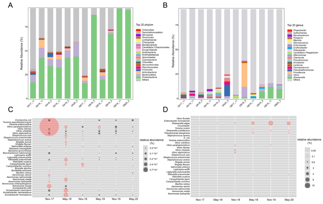 在DY的宏基因組數據中大量檢測到40種病原體,包括水傳播致病菌和呼吸道致病菌。2019年后,鮑曼不動桿菌、副溶血性弧菌、霍亂弧菌、溶藻弧菌、創傷弧菌、肺炎克雷伯菌、腸沙門氏菌、結核分枝桿菌和空腸彎曲桿菌等幾種檢測到的病原體的相對豐度有所增加。相比之下,其他物種在2017年至2020年期間有所減少,例如韋羅尼氣單胞菌、嗜肺氣單胞菌和邦格里沙門氏菌(圖2B),隨后培養實驗,檢測出其中32種細菌。